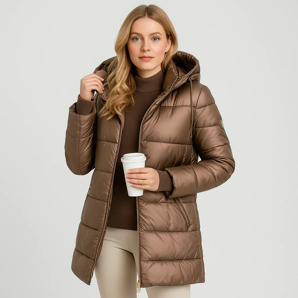 Deze dames lange winterjas met capuchon biedt de perfecte balans tussen stijl en functionaliteit. Het moderne, gewatteerde ontwerp houdt je comfortabel op koude dagen, terwijl de elegante pasvorm zorgt voor een verfijnde winterlook.