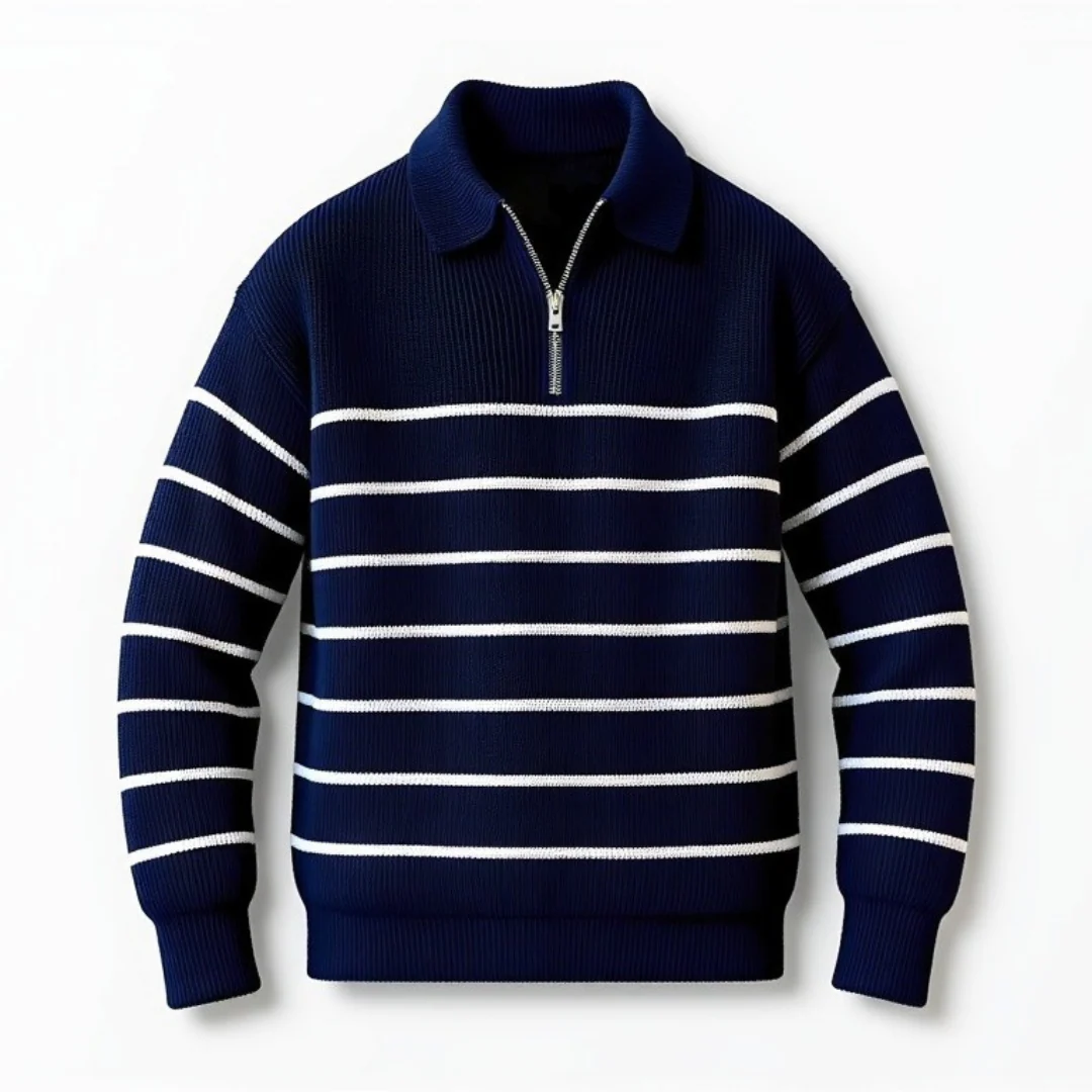 Deze gestreepte herentrui met halve rits biedt een perfecte mix van klassiek design en modern comfort. De kraag en subtiele horizontale strepen geven de trui een verzorgde, maritieme uitstraling die bij elke gelegenheid past.