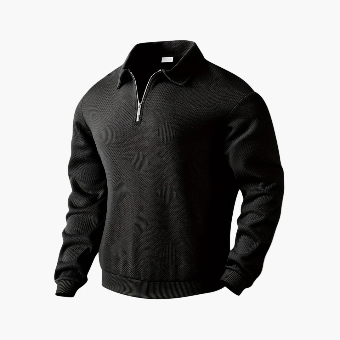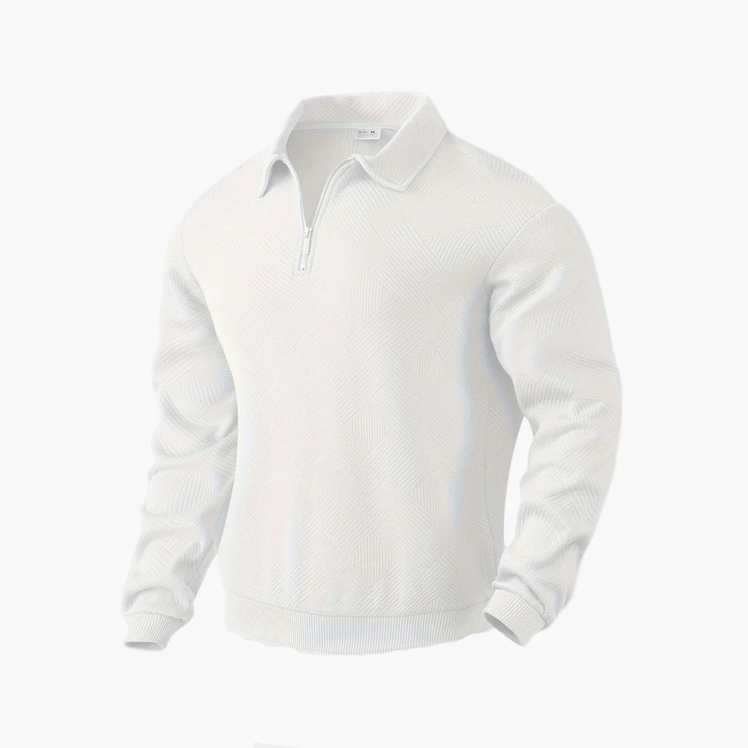 De trui heeft een subtiele structuur en een moderne kraag met korte rits, waardoor je de stijl eenvoudig kunt aanpassen. Dankzij de comfortabele pasvorm en zachte stof voelt hij prettig aan, zowel thuis als onderweg.
