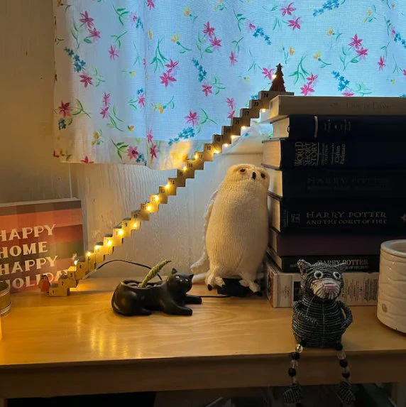 Het compacte ontwerp maakt dit item ideaal voor boekenkasten, vensterbanken, dressoirs of werkplekken. De houten trap en kleine figuren creëren een warme, nostalgische uitstraling die perfect past bij decemberdecoratie.