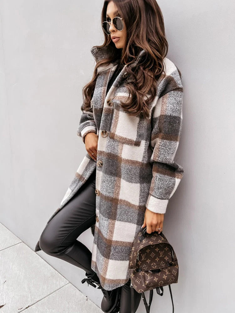 Deze lange damesmantel met ruitpatroon combineert warmte en stijl in één. Het oversized design geeft een moderne uitstraling en maakt de jas comfortabel om dagelijks te dragen. Een perfecte keuze voor de koudere seizoenen.