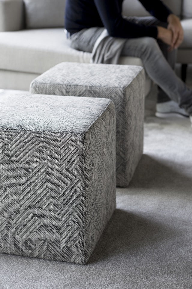 De poef DJ Cube van de Belgische meubelontwerper Passe Partout kan naar eigen wens samengesteld worden door de ruime keuze uit stoffen.