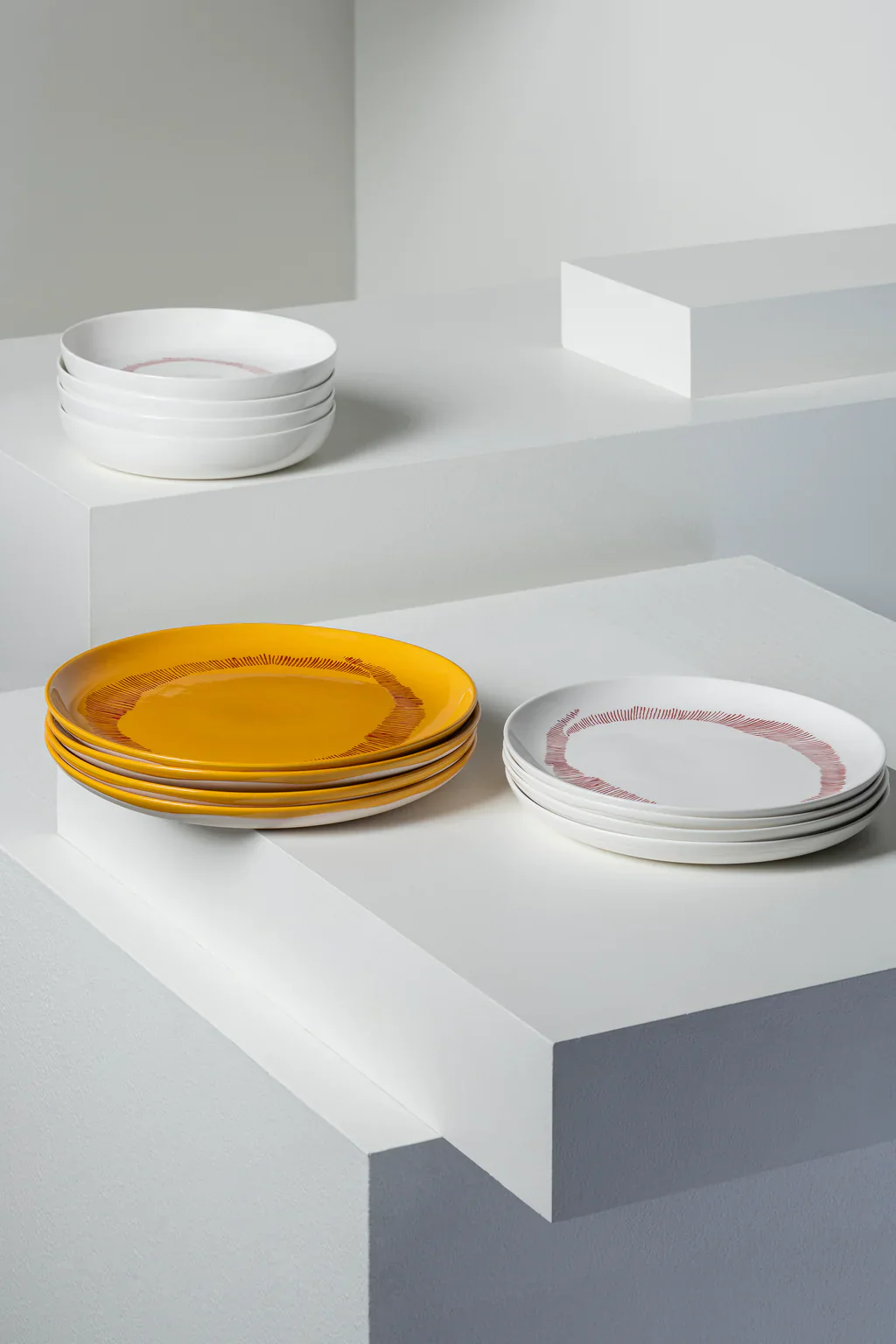 Het handgeschilderde keramiek is afgewerkt met een subtiele semiglazuur, waardoor elk stuk uniek is. Je ontvangt één wit bord met een rode ‘O’, met een diameter van 22,5 cm en een hoogte van 2 cm.