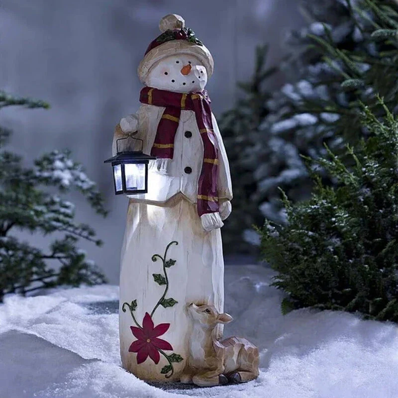 De sneeuwpop is afgewerkt met fijne winterdetails zoals een sjaal, kerstbloemmotief en een lantaarn die oplicht. Door de rustige, klassieke uitstraling past het beeld bij zowel moderne als traditionele kerstdecoraties.